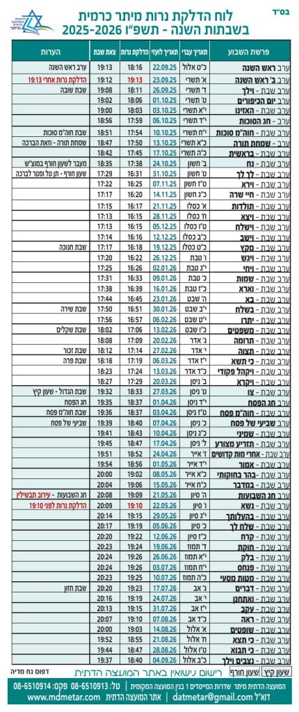 המועצה הדתית מיתר שמה לה למטרה להפיק מידי שנה לוחות זמנים של שקיעה וזריחה, כניסת ויציאת החגים במדוייק כדי לשרת אתכם התושבים.במידה ונתקלתם בשאלה או בטעות נשמח שפנו אלינו דרך האתר.בברכת שנה טובה ומתוקה לנו ולכל בית ישראל,צוות המועצה הדתית. להורדת לוח הדלקת נרות תשפ"ה לחצו כאן להורדת לוח הדלקת נרות תשפ"ו לחצו כאן
