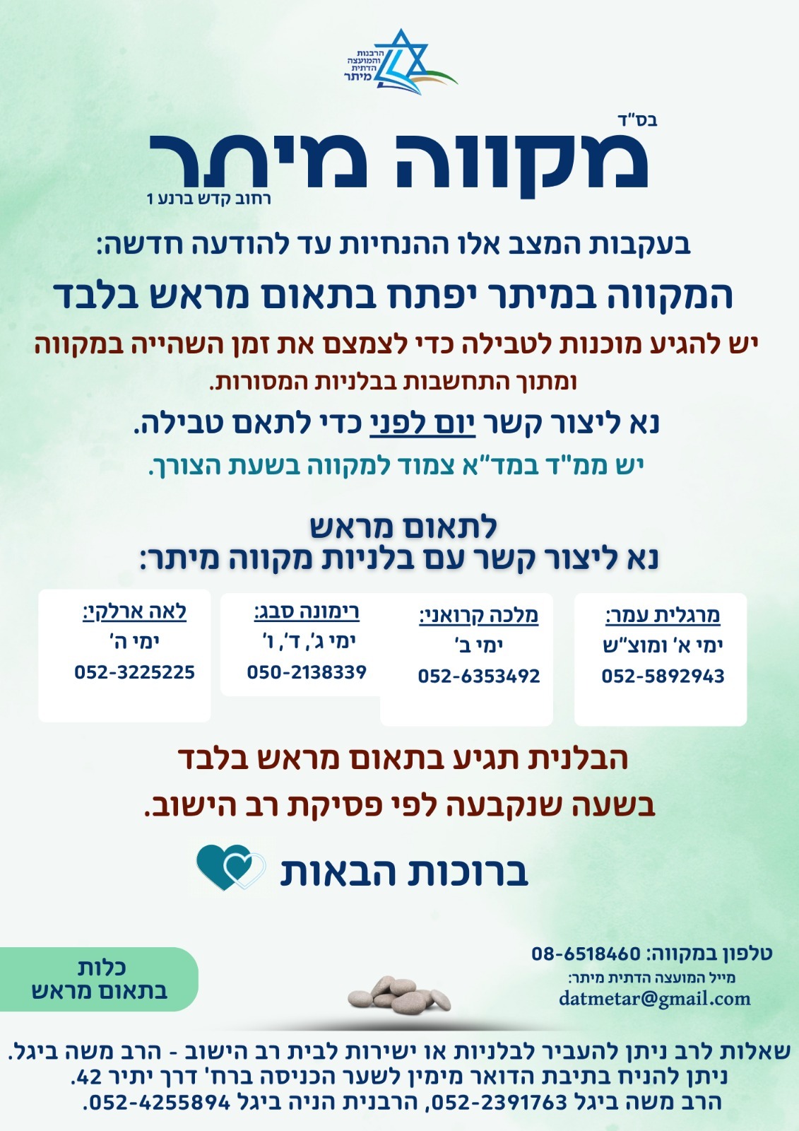 כמו כן בעוד מספר חודשים מסתיים בניית מקווה חדש שיהיה נגיש,